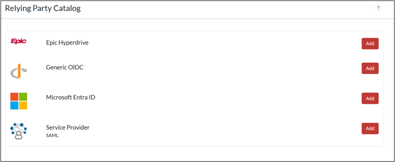 - On the Relying Party Catalog page, click Add for Service Provider SAML.