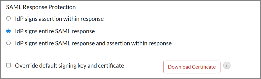 - Under the Message Protection section, choose IdP signs entire SAML response.