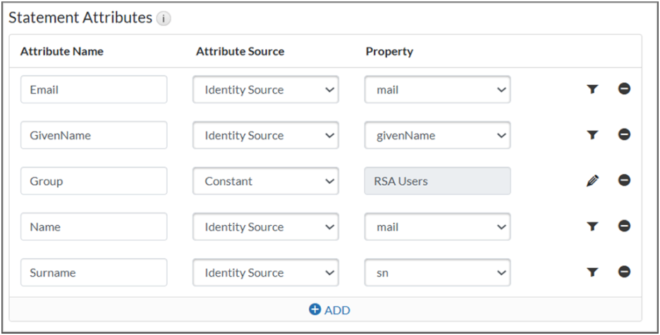 - Under the Statement Attributes section, add the following attributes as shown in the screenshot, which the IdP must provide in the assertion: