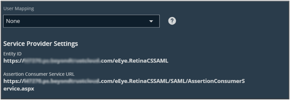 - Service Provider Entity ID: https://< beyondinsight-domain-name>/eEye.RetinaCSSAML