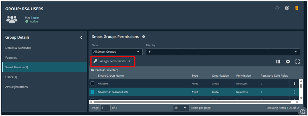 - Select the checkbox next to the Smart Group where Password Safe should be enabled, and then click Assign Permissions.