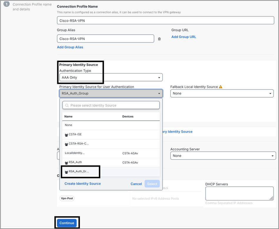 - On the Add ASA Identity Source page, provide the following details and click Continue.