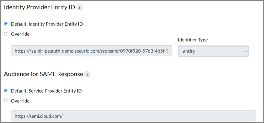 - Proceed with the Default option for Identity Provider Entity ID and Audience for SAML Response.