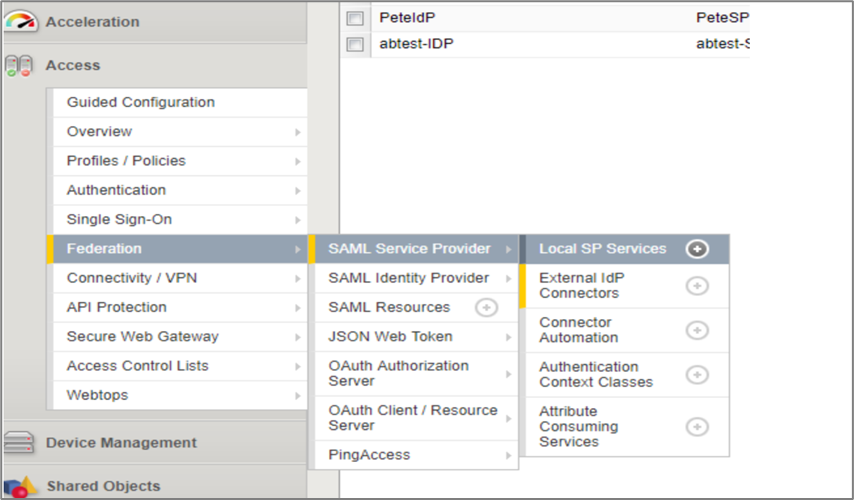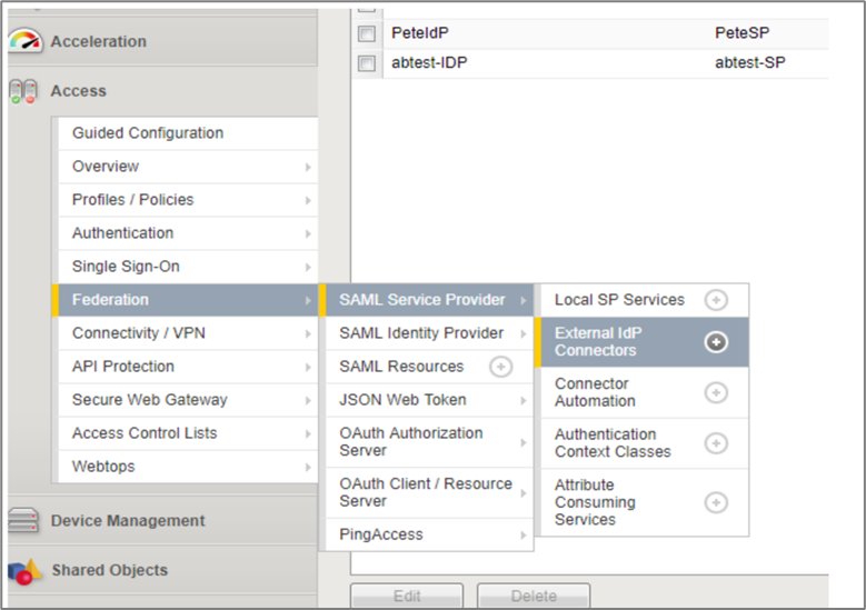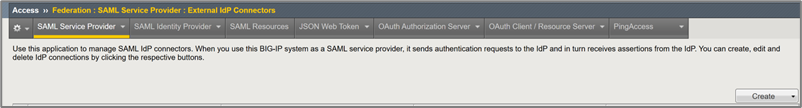 - Click Access > Federation > SAML Service Provider > External IdP Connectors.