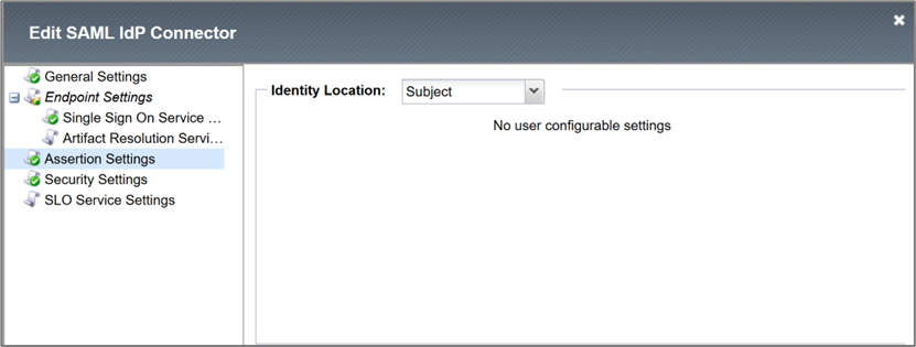 - On the Create New SAML IdP Connector window, under Assertion Settings, select Identity Location as Subject in the drop-down list.