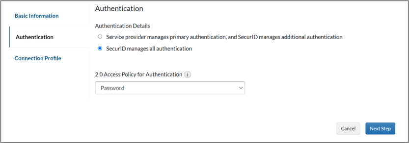 - On the Authentication page, choose SecurID Access manages all authentication.