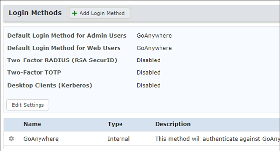 - Select Default Login Methods tab and you could change Admin Users and/or Web Users to use the login method we previously configured.