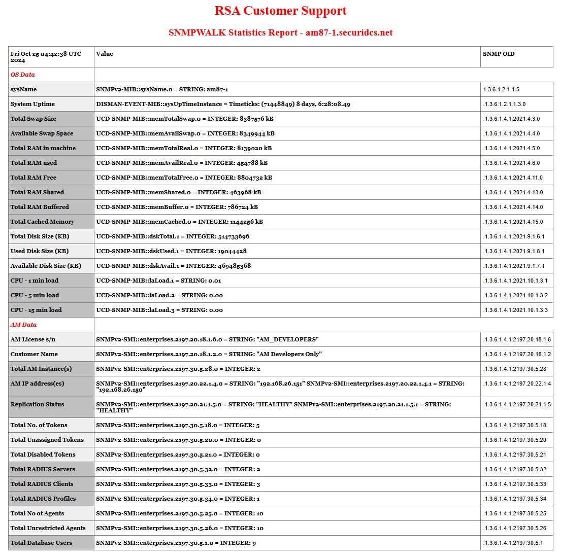 rsaadmin@am87-1:~> sudo su - [sudo] password for rsaadmin: am87-1:~ # cd /tmp am87-1:/tmp # ./SNMPdatacollect.sh snmpuser password SHA password AES - Date : Fri Oct 25 04:42:38 UTC 202 - General Usage: SNMPdatacollect.sh [Security Name] [Authentication Password] [Authentication Protocol] [Privacy Password] [Privacy Protocol] - Checking SNMPwalk parameters.. - parameters provided were validated... - using SNMPWALK to obtain the data for the HTML report... - System Name : SNMPv2-MIB::sysName.0 = STRING: am87-1 - System Uptime : DISMAN-EVENT-MIB::sysUpTimeInstance = Timeticks: (71448849) 8 days, 6:28:08.49 - Total Swap Size : UCD-SNMP-MIB::memTotalSwap.0 = INTEGER: 8387576 kB - Available Swap Space : UCD-SNMP-MIB::memAvailSwap.0 = INTEGER: 8349944 kB - Total RAM in machine : UCD-SNMP-MIB::memTotalReal.0 = INTEGER: 8139020 kB - Total RAM used : UCD-SNMP-MIB::memAvailReal.0 = INTEGER: 454788 kB - Total RAM Free : UCD-SNMP-MIB::memTotalFree.0 = INTEGER: 8804732 kB - Total RAM Shared : UCD-SNMP-MIB::memShared.0 = INTEGER: 463968 kB - Total RAM Buffered : UCD-SNMP-MIB::memBuffer.0 = INTEGER: 786724 kB - Total Cached Memory : UCD-SNMP-MIB::memCached.0 = INTEGER: 1144256 kB - Total Disk Size (KB) : UCD-SNMP-MIB::dskTotal.1 = INTEGER: 514733696 - Used Disk Size (KB) : UCD-SNMP-MIB::dskUsed.1 = INTEGER: 19044428 - Available Disk Size : UCD-SNMP-MIB::dskAvail.1 = INTEGER: 469485368 - CPU - 1 min load : UCD-SNMP-MIB::laLoad.1 = STRING: 0.01 - CPU - 5 min load : UCD-SNMP-MIB::laLoad.2 = STRING: 0.00 - CPU - 15 min load : UCD-SNMP-MIB::laLoad.3 = STRING: 0.00 - AM License s/n : SNMPv2-SMI::enterprises.2197.20.18.1.6.0 = STRING: "AM_DEVELOPERS" - Customer Name : SNMPv2-SMI::enterprises.2197.20.18.1.2.0 = STRING: "AM Developers Only" - Total AM Instance(s) : SNMPv2-SMI::enterprises.2197.30.5.28.0 = INTEGER: 2 - AM IP address(es) : SNMPv2-SMI::enterprises.2197.20.22.1.4.0 = STRING: "192.168.26.151" SNMPv2-SMI::enterprises.2197.20.22.1.4.1 = STRING: "192.168.26.150" - Replication Status : SNMPv2-SMI::enterprises.2197.20.21.1.5.0 = STRING: "HEALTHY" SNMPv2-SMI::enterprises.2197.20.21.1.5.1 = STRING: "HEALTHY" - Total No. of Tokens : SNMPv2-SMI::enterprises.2197.30.5.18.0 = INTEGER: 5 - Total Unassigned Tokens : SNMPv2-SMI::enterprises.2197.30.5.20.0 = INTEGER: 0 - Total Disabled Tokens : SNMPv2-SMI::enterprises.2197.30.5.21.0 = INTEGER: 0 - Total RADIUS Servers : SNMPv2-SMI::enterprises.2197.30.5.32.0 = INTEGER: 2 - Total RADIUS Clients : SNMPv2-SMI::enterprises.2197.30.5.33.0 = INTEGER: 3 - Total RADIUS Profiles : SNMPv2-SMI::enterprises.2197.30.5.34.0 = INTEGER: 1 - Total No. of Agents : SNMPv2-SMI::enterprises.2197.30.5.25.0 = INTEGER: 10 - Total Unrestricted Agents : SNMPv2-SMI::enterprises.2197.30.5.26.0 = INTEGER: 10 - Total Database Users : SNMPv2-SMI::enterprises.2197.30.5.1.0 = INTEGER: 9 - Generating HTML report... -- HTML Report name : /tmp/SNMPreport_202410250442.html - Done!