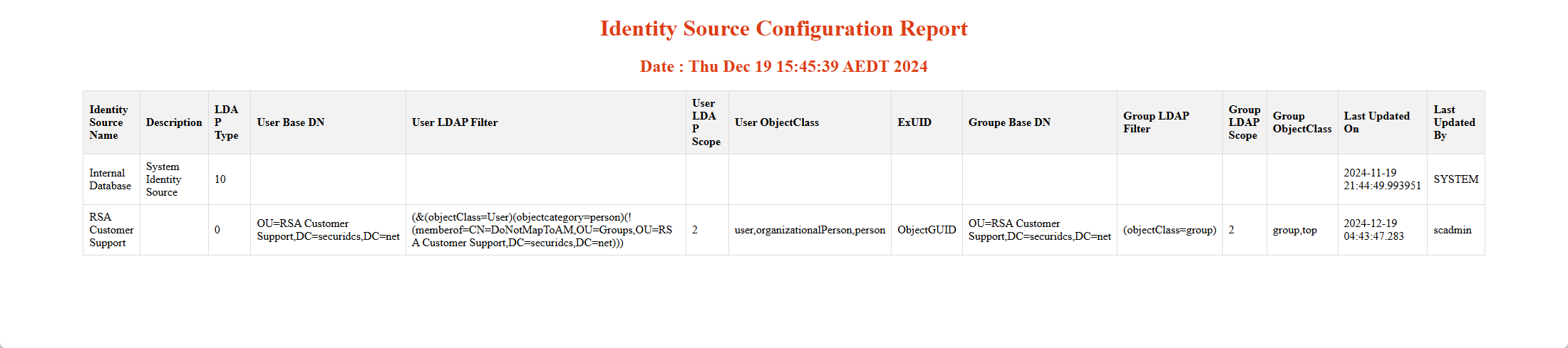 An example of the Identity Source Configuration Report: