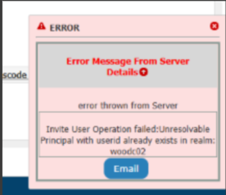 1- Inviting a user to RSA throw Error: Invite User Operation failed: Unresolvable Principal with userid already exists in realm: xxxx01 (UserID)