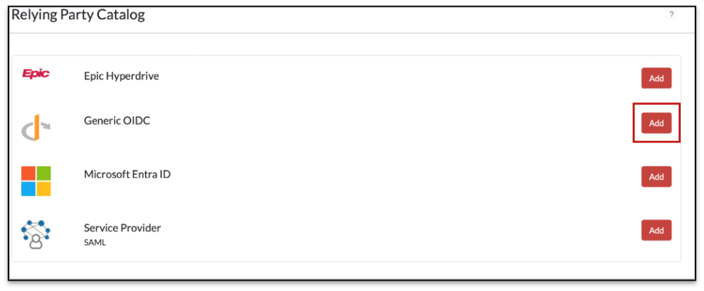 - From the Relying Party Catalog select the Add button for Generic OIDC.