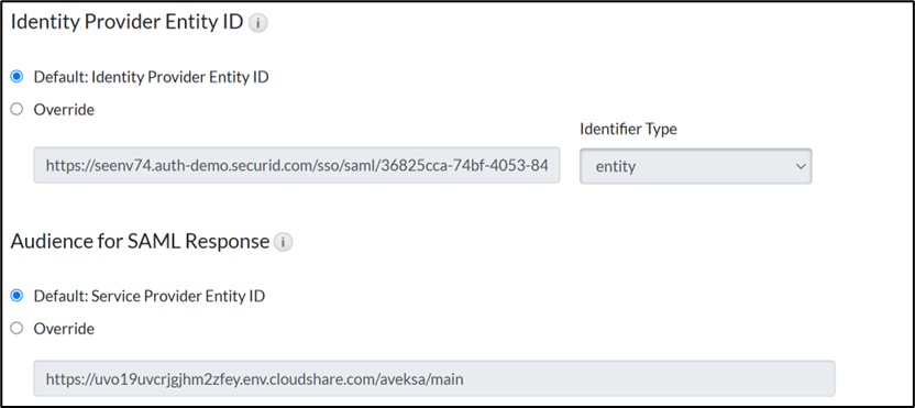 - On the Identity Provider Entity ID section, select the Default option and Audience for SAML Response.