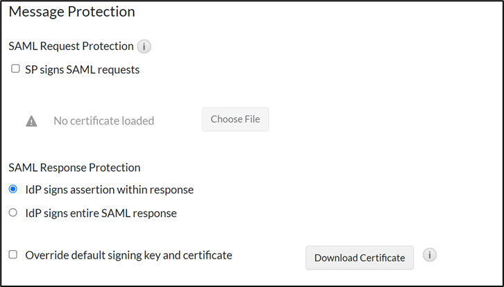 - In the Message Protection section, for SAML Response Protection section, select the following information: