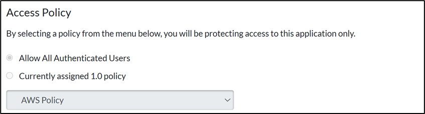 - Select Allow All Authenticated Users, from the dropdown select the policy for this application.