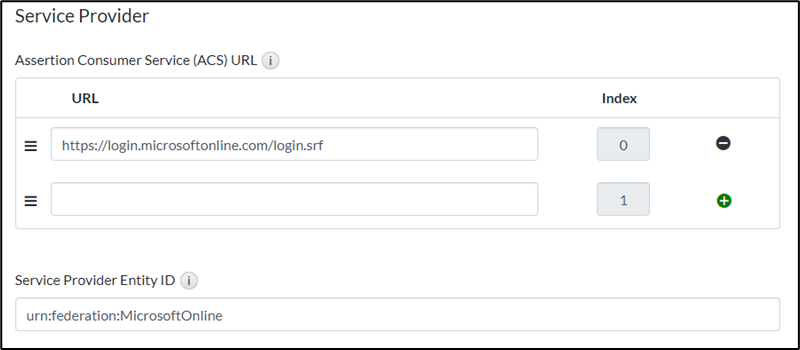 - Service Provider Entity ID: Enter the Microsoft Issuer "urn:federation:MicrosoftOnline".
