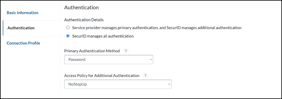 - On the Authentication page, select SecurID manages all authentication.