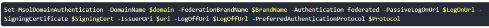- To modify any configuration settings made in Windows PowerShell after federating the necessary domain, use the command Set-MsolDomainFederationSettings instead of Set-MsolDomainAuthentication as the domain is already federated.