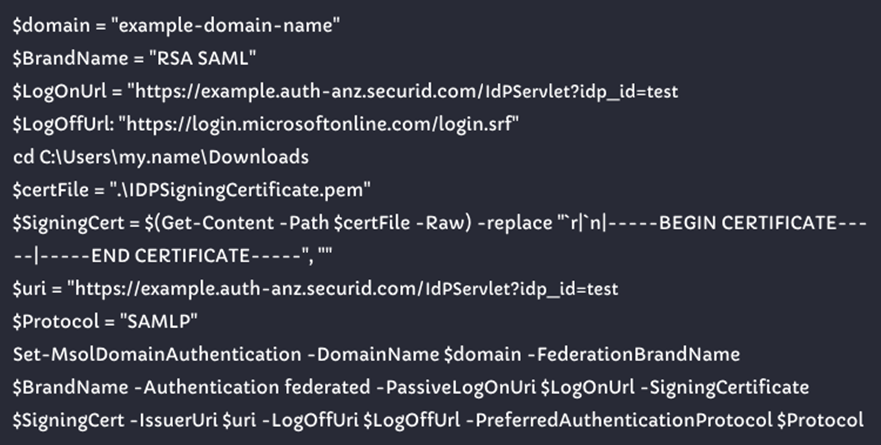 - Run the following script in a PowerShell environment. Most of the values come from RSA Cloud Authentication Service configuration section:
