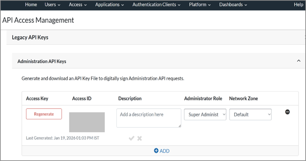 - Use the API key generated to create an access token. Sample code is provided by RSA to generate an access token from the API key. For details, refer to Authentication for the Cloud Administration APIs.