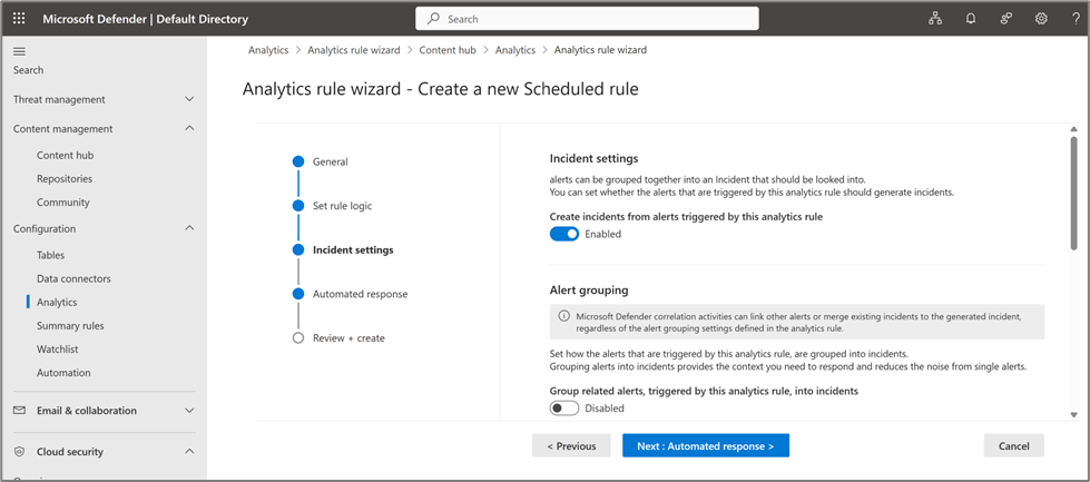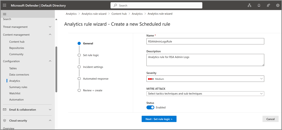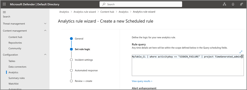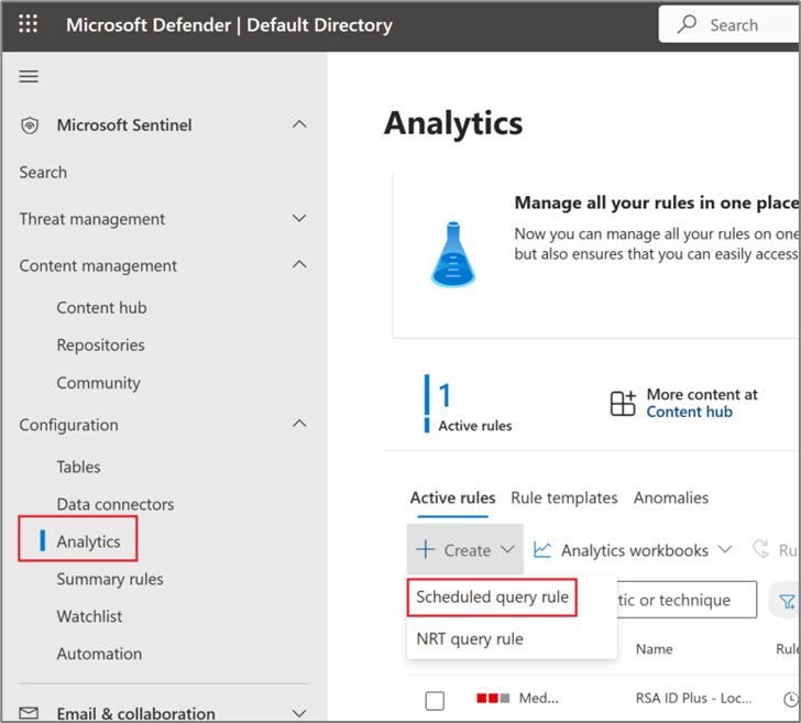 - Click Configuration > Analytics > Create > Scheduled query rule.
