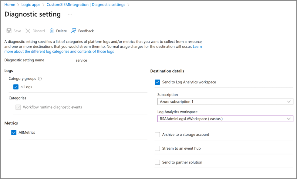 - Go to Monitoring > Diagnostic settings and make sure allLogs checkbox is selected.