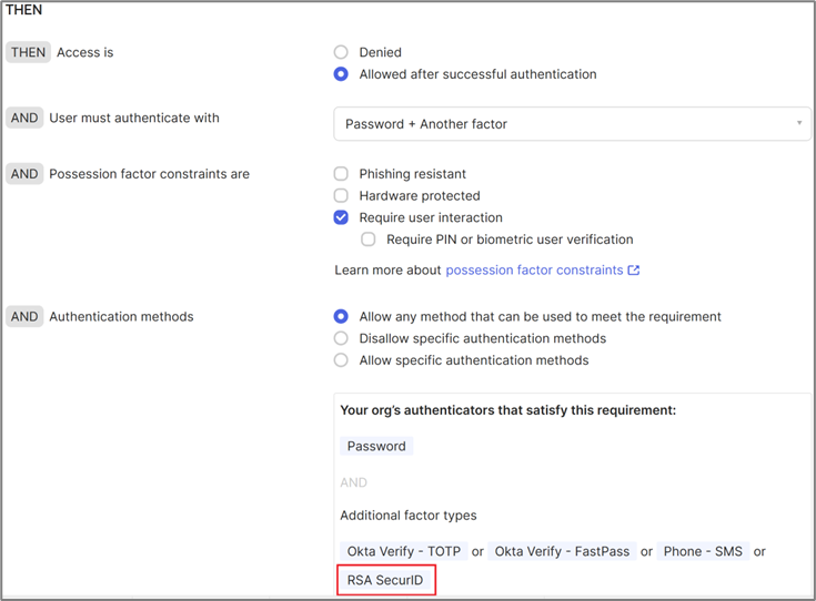 - Make sure the policy for the Okta Admin Console app has RSA SecurID as an Additional factor type.