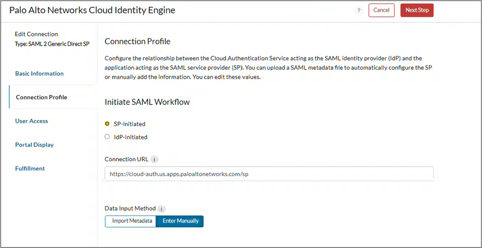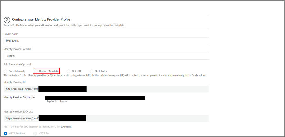 - Under Data Input Method, choose Import Metadata and import the metadata obtained from Palo Alto.
