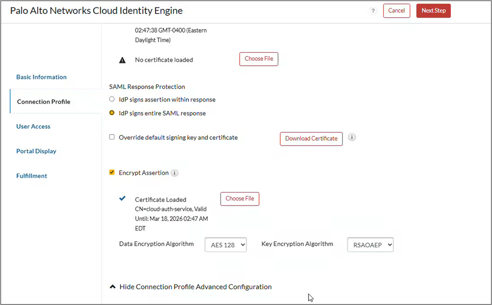 - Encrypt Assertion is selected, and the certificate for encrypting the assertion is uploaded.
