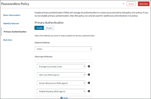 - In the Cloud Administration Console, go to Access > Policies, and in the Primary Authentication tab, add one or more of the following methods:
