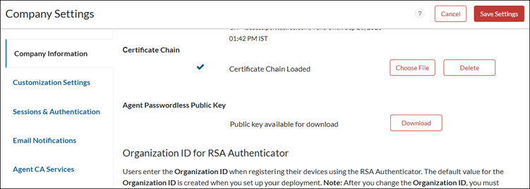 To connect the agent to RSA Authentication, you need to copy the configuration details from the Cloud Administration Console, as explained below, and use them later during configuration.