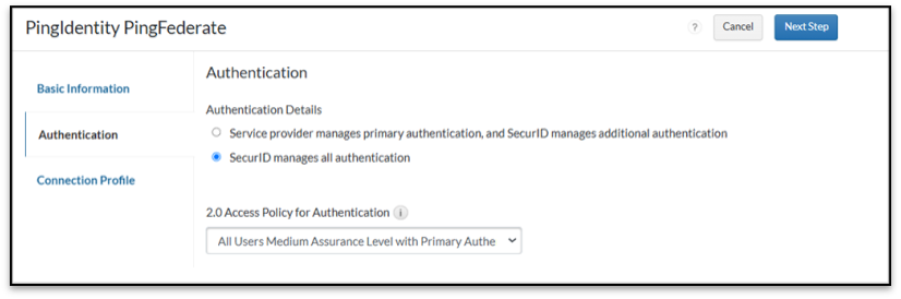 - From 2.0 Access Policy for Authentication dropdown list, select a policy that was previously configured.