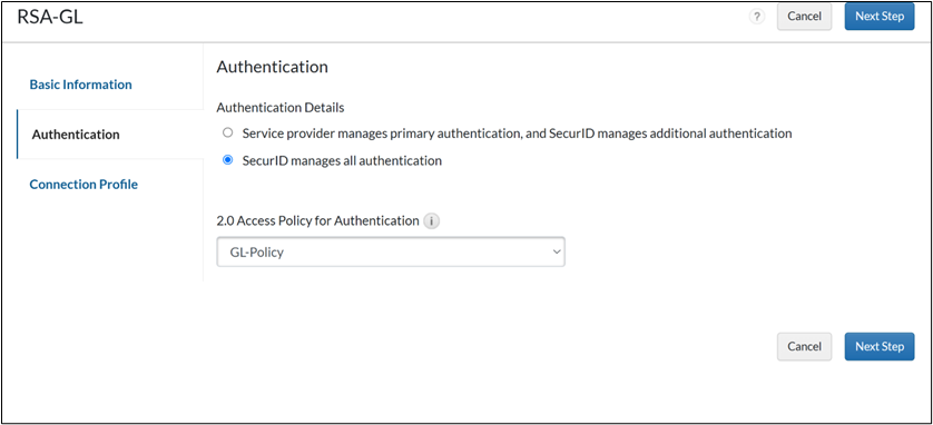 - On the Authentication page, select SecurID Access manages all authentication.