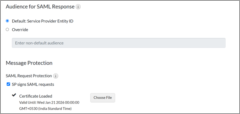 - On the Audience for SAML Response section, select the Default: Service Provider Entity ID option.