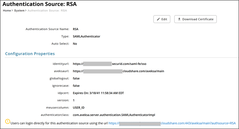 - Configuration properties Identity URL : copy the identity URL from RSA.
