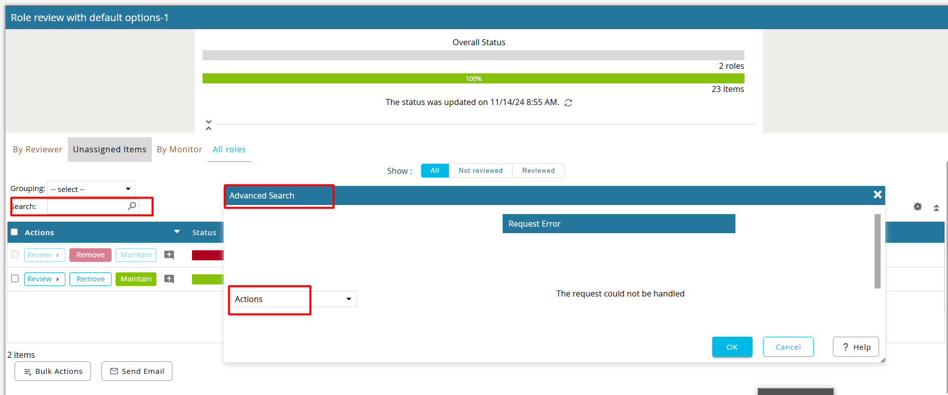 After running a Role Review, and navigating to the Results tab then pressing the Review Items button. A Request Error window will pop up upon using the Advanced search bar, then selecting Actions to filter the search. This will show a "The request could not be handled" error.