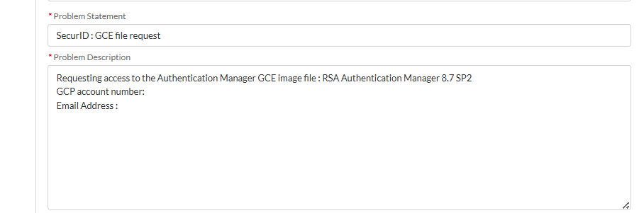 Existing RSA Authentication Manager customers must open an RSA support case to request access to the Authentication Manager Google Compute Engine (GCE) file needed for GCP deployment