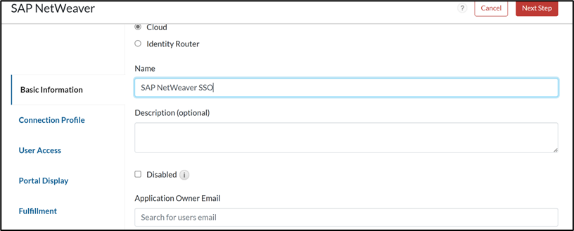 - Enter the Name for the application, and click Next Step.