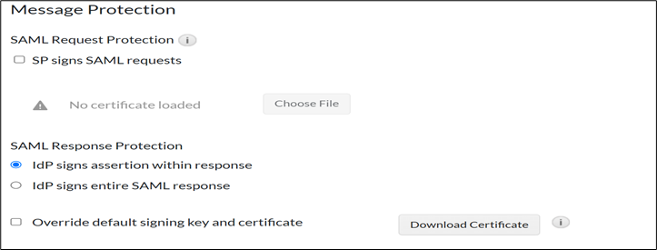 - In the Message Protection section, for SAML Response Protection: