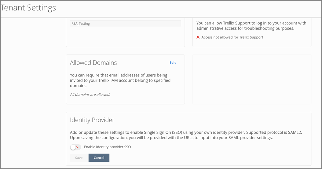 - Edit the Identity Provider section under Tenant Settings and click the Enable Identity Provider SSO toggle switch.