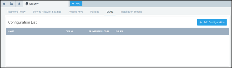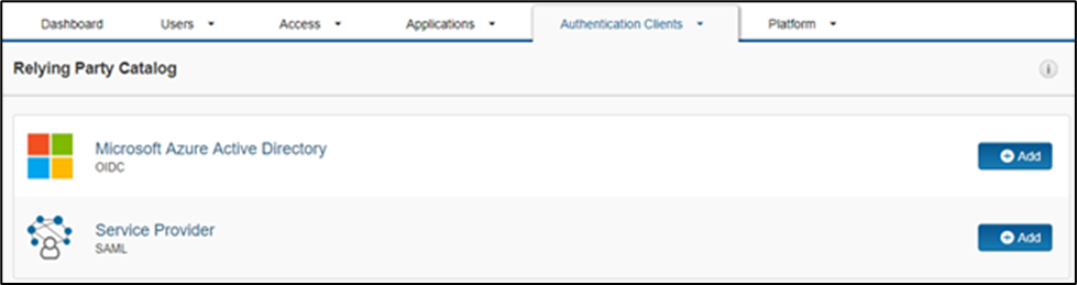 - From the Relying Party Catalog select the +Add button for Service Provider SAML.