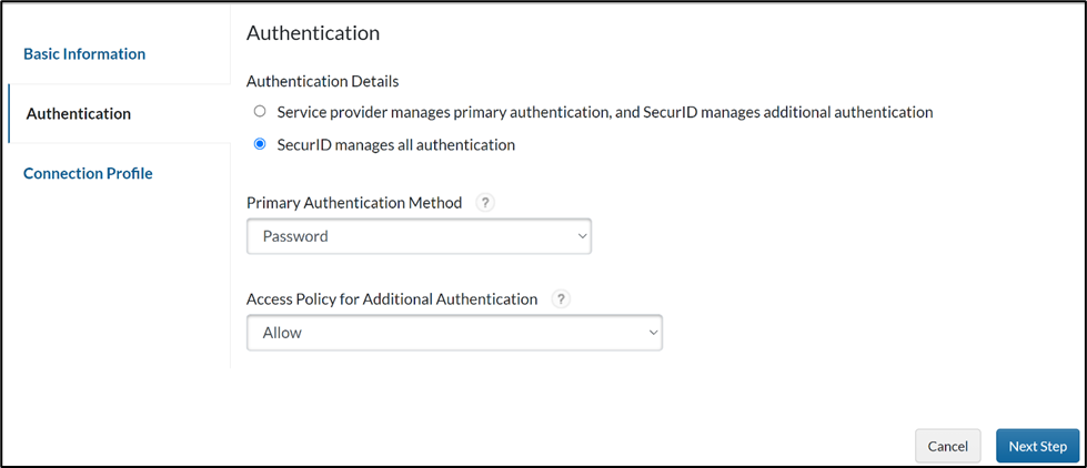 - On the Authentication page, select RSA SecurID Access manages all authentication.