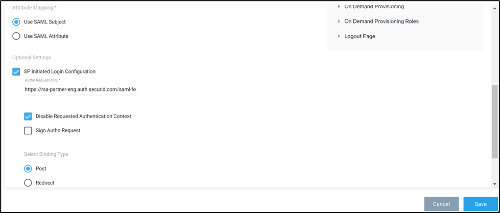 Authn Request URL: Enter the entityID of Configure RSA Cloud Authentication Service section.