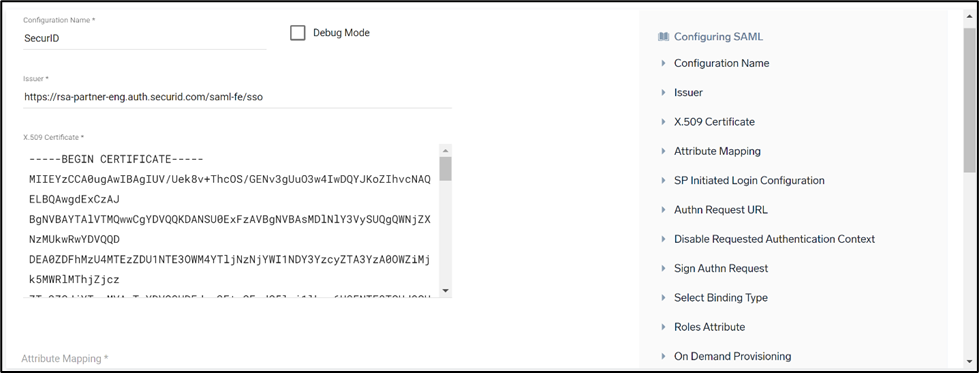 X.509 Certificate: Enter the content of the certificate downloaded of Configure RSA Cloud Authentication Service section.