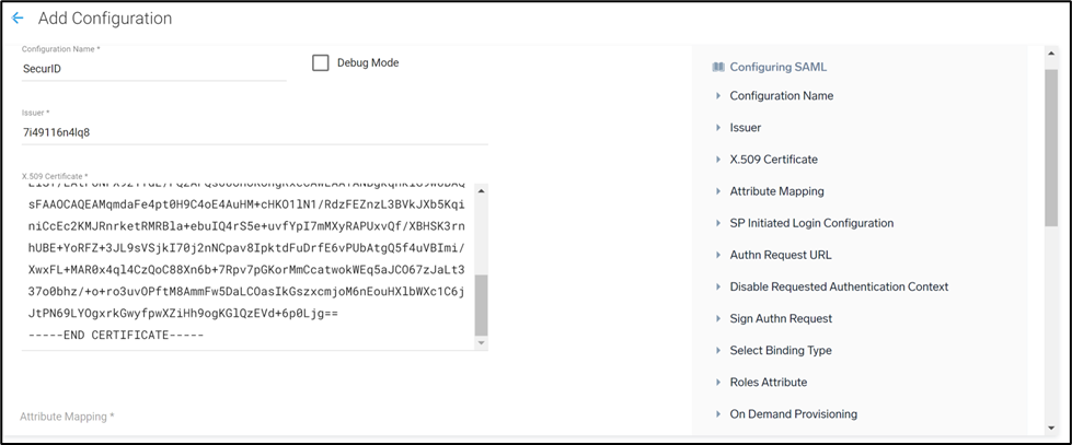 X.509 Certificate: Enter the content of the certificate downloaded of Configure RSA Cloud Authentication Service section.
