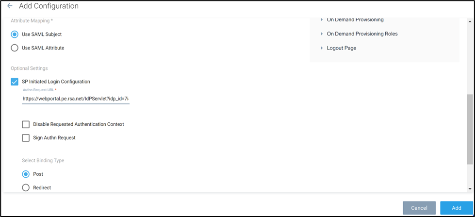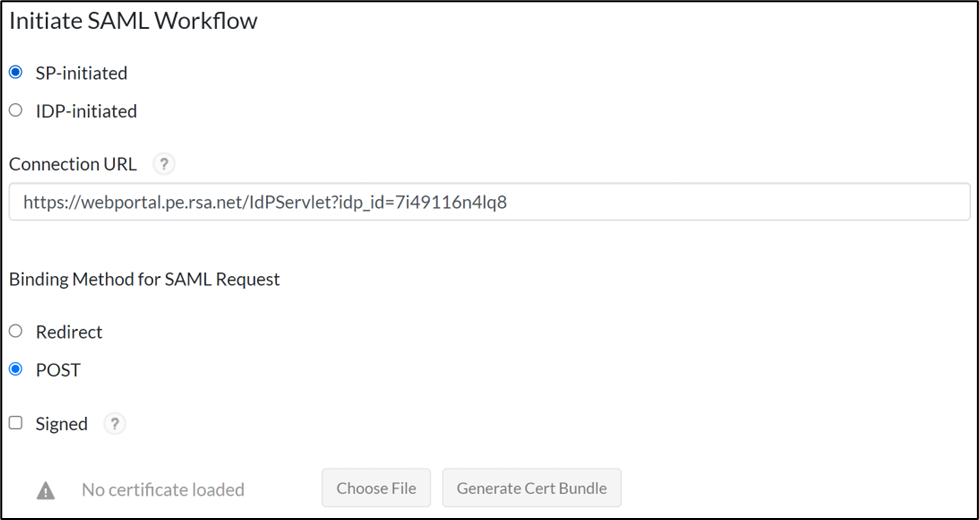 Authn Request URL: Enter the Identity Provider URL of Configure RSA Cloud Authentication Service section.
