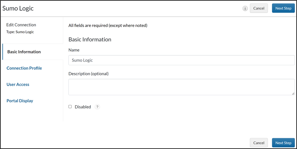 - Enter a name for the application in the Name field on the Basic Information page and click the Next Step button.