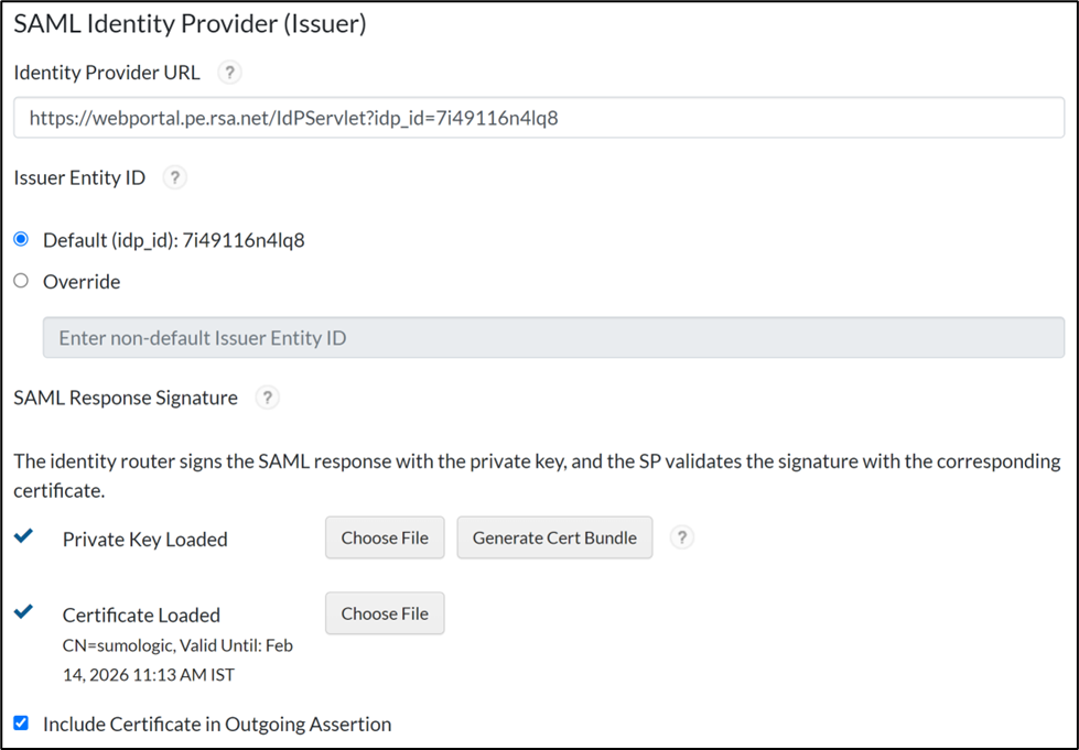 - In SAML Identity Provider (Issuer) section. Click Generate Cert Bundle, enter the Common Name and Generate and Download the certificate. This certificate will be required of Configure SAML in Sumologic section.