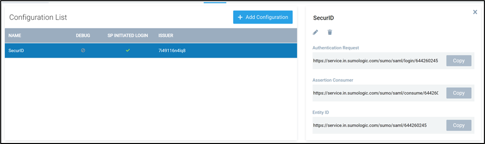 Click on the configuration row created above, SP configuration should be visible. These configuration are required of Configure RSA Cloud Authentication Service section.