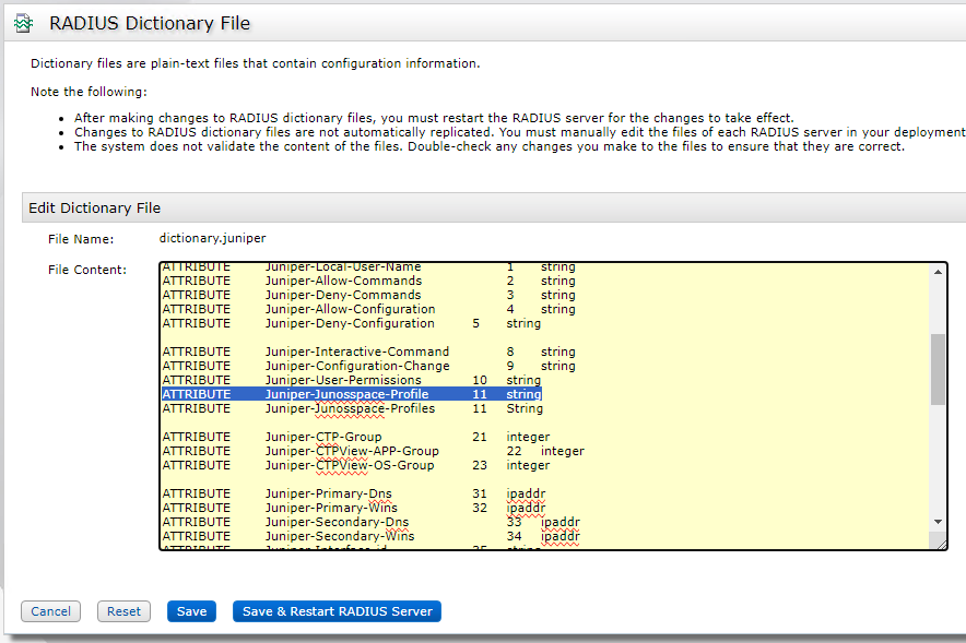 Locate the dictionary called “dictionary.juniper” and left-click the File Name > select Edit > scroll down the dictionary file to the line “ATTRIBUTE Juniper-Junosspace-Profile 11 String"