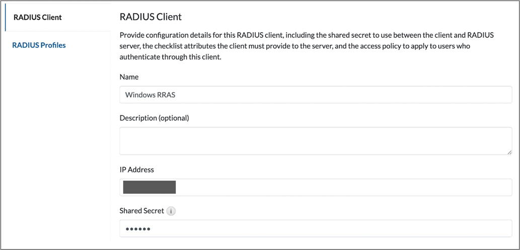 - Name: Enter a descriptive name for the RADIUS client (Windows RRAS server).